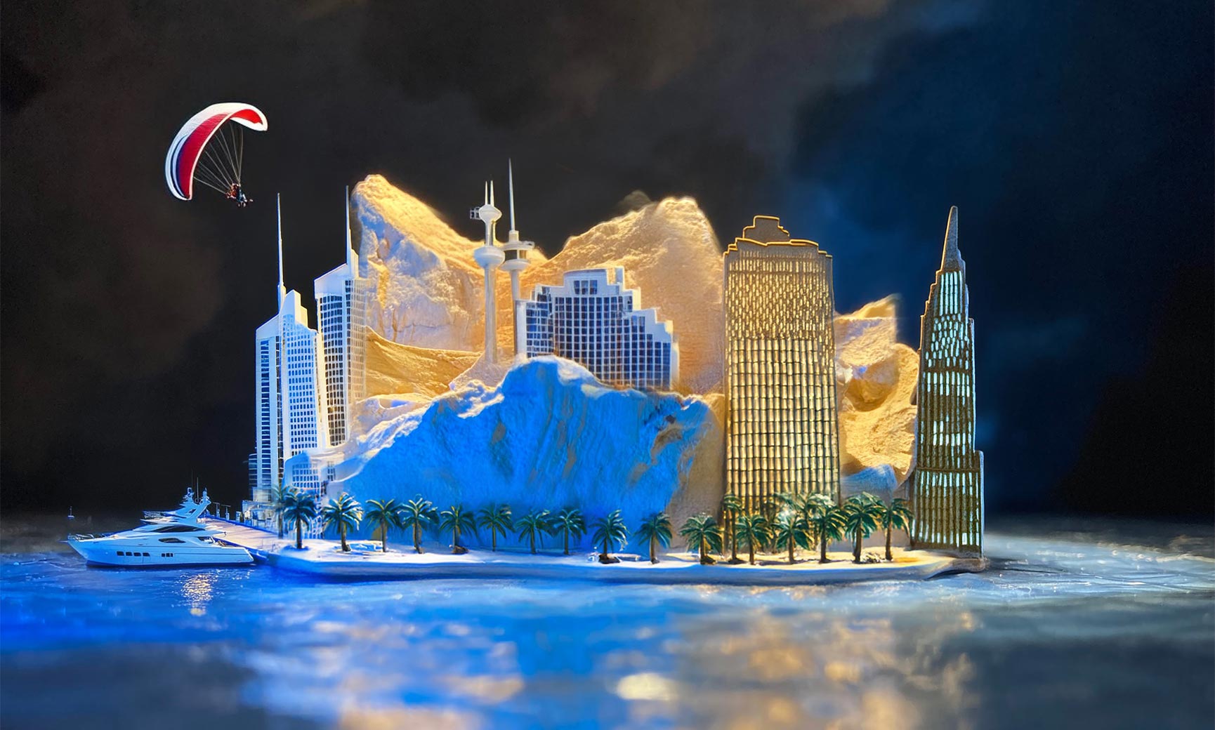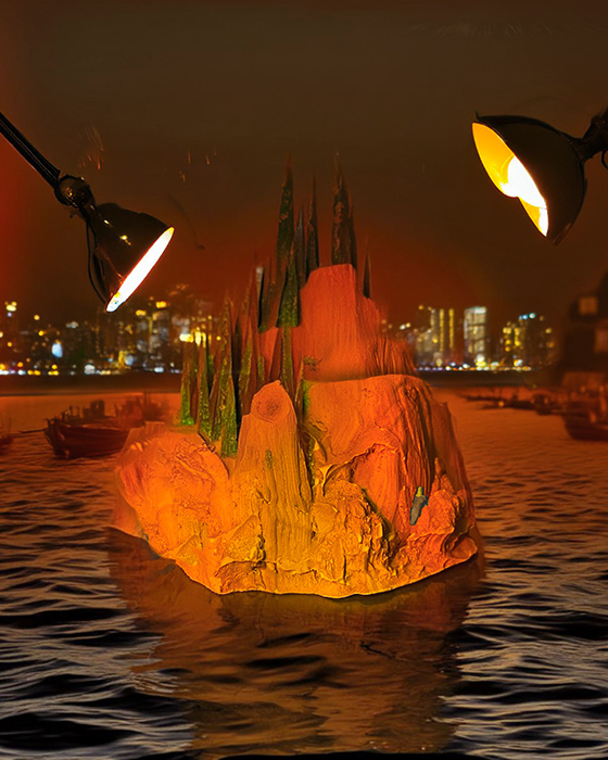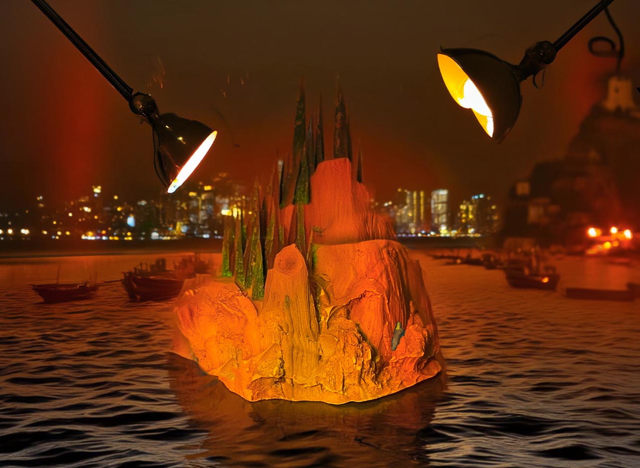 Manchmal entstanden Bilder, die man so nicht geplant hat und mit denen man weiterarbeiten konnte. Eigentlich wollte ich einen Mond einfügen lassen, aber es kamen diese beiden Lampen heraus. Das passte zum Beginn unseres Projekts mit den Lichtinszenierungen.
