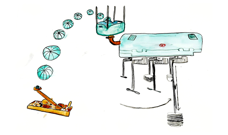 Die ersten Klassen haben im Bildnerischen Gestalten Apparate erfunden, die Zukunftsvisionen sichtbar machen.