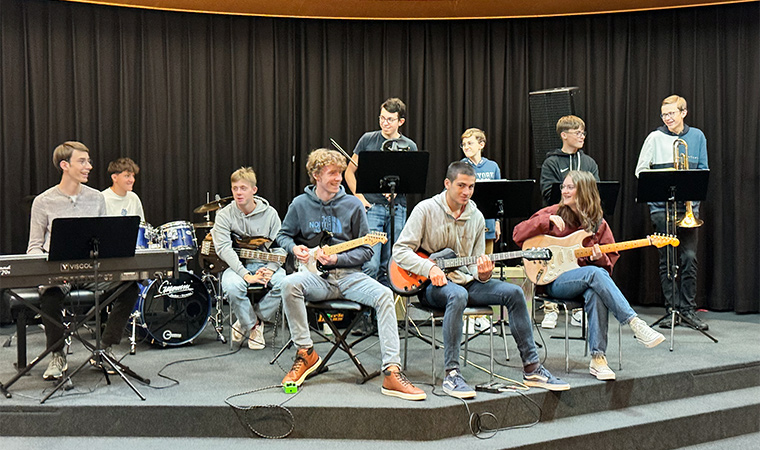 Im Bandraum werden jeweils am Mittwochmittag die Instrumentenkoffer geöffnet und die verschiedenen Holz- und Blechblasinstrumente zusammengebaut. Erste Stimmtöne erklingen und die Saiten von Geige, Gitarre und Bass werden gestimmt. Wenn auch die Keyboards mit den Verstärkern verbunden sind und der Schlagzeuger sich eingerichtet hat, ist alles bereit für den ersten Song. Es wird an Popsongs, Jazzstandards oder Balladen geübt, mit dem Ziel, verschiedene Musikstile kennenzulernen und die zugehörigen Spieltechniken zu erlernen. Gemeinsam als Band werden eigene Ideen kompositorisch umgesetzt und Techniken zur Improvisation erlernt. Einzelne Schülerinnen und Schüler üben Soli, sodass zum Schluss Songs entstehen, die zu den zwölf Schülerinnen und Schülern der Band optimal passen.